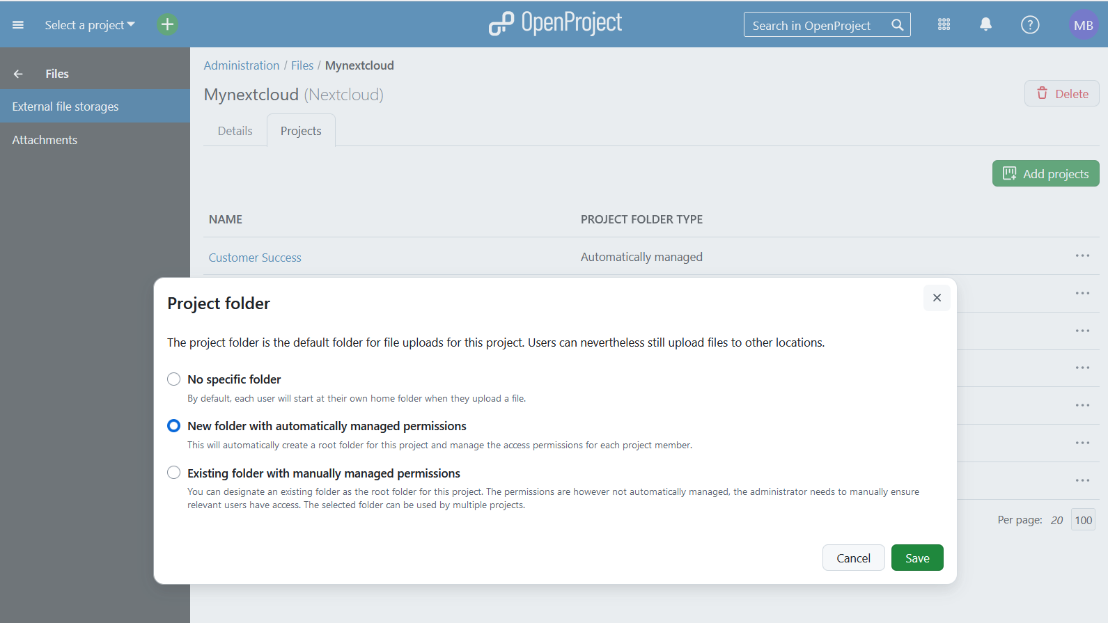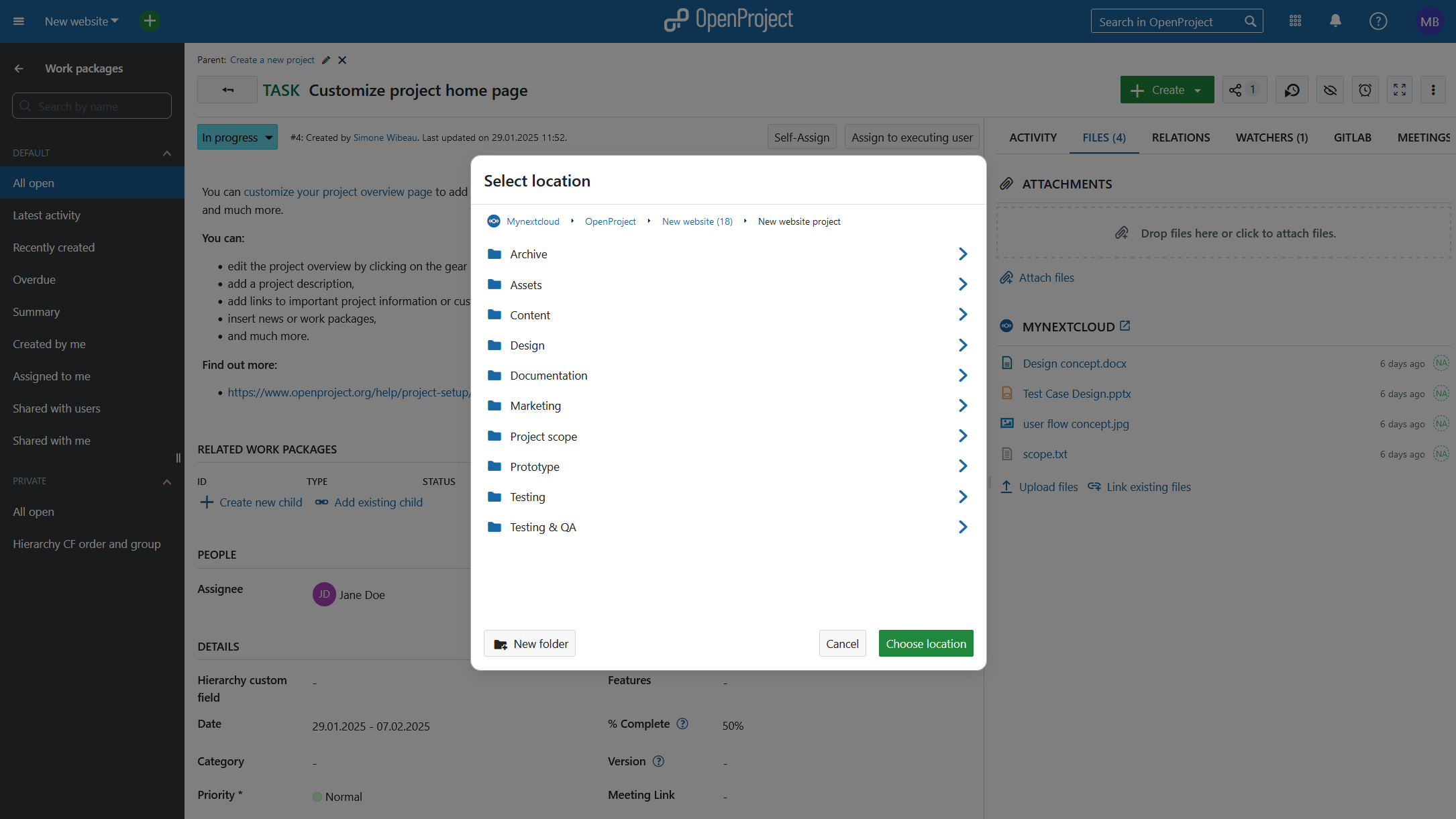 Cree fácilmente nuevas carpetas en Nextcloud directamente desde OpenProject, para que sus documentos permanezcan estructurados y adaptables a medida que avanza el proyecto.