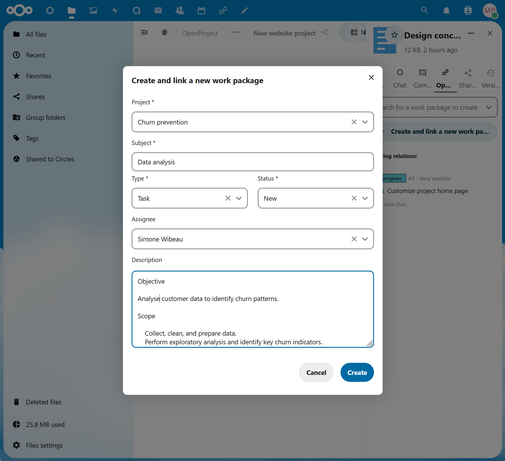 Cree y vincule paquetes de trabajo directamente en Nextcloud. Tanto si está navegando por los archivos del proyecto como si está intercambiando ideas en carpetas compartidas, puede conectar instantáneamente las tareas a su sistema de gestión de proyectos sin interrumpir su flujo de trabajo.