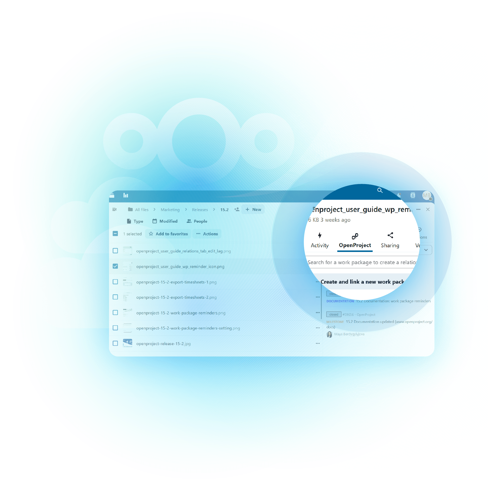 Cargue y gestione archivos directamente en OpenProject sin cambiar de plataforma. Vincule archivos y carpetas de Nextcloud a paquetes de trabajo, garantizando que sus documentos sean fácilmente accesibles, estén actualizados y disponibles donde se necesiten.