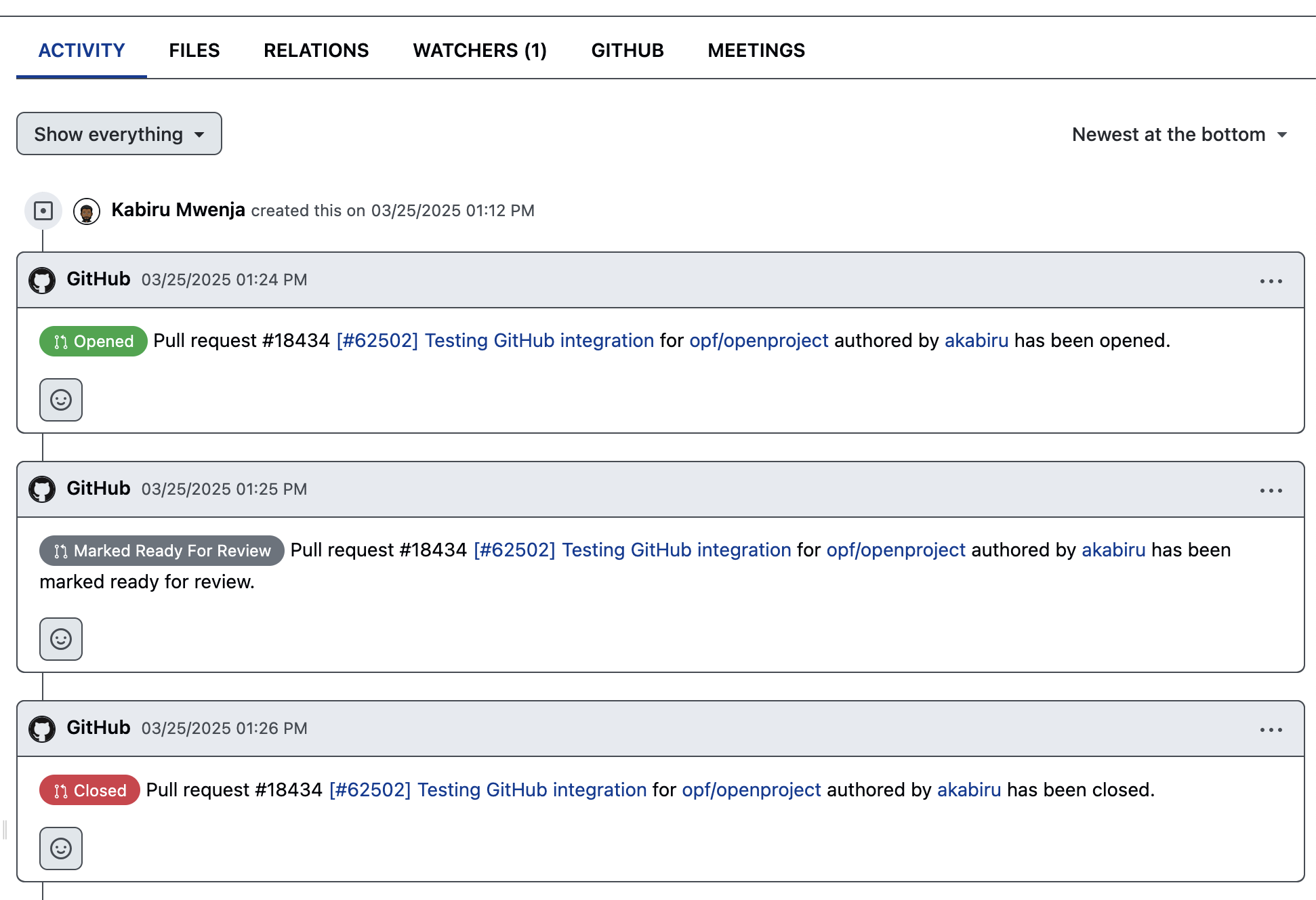 Si ha incluido la referencia del paquete de trabajo (OP#ID o URL) en su mensaje de confirmación o en la rama con el nombre que incluye el ID del paquete de trabajo, tal y como se indica en los fragmentos de git, OpenProject añade automáticamente la información de PR a las pestañas Actividad y GitHub del paquete de trabajo. Los cambios de estado, como abierto, marcado como listo para revisión o cerrado, se registran automáticamente, por lo que puede mantenerse al día sin cambiar de herramienta.