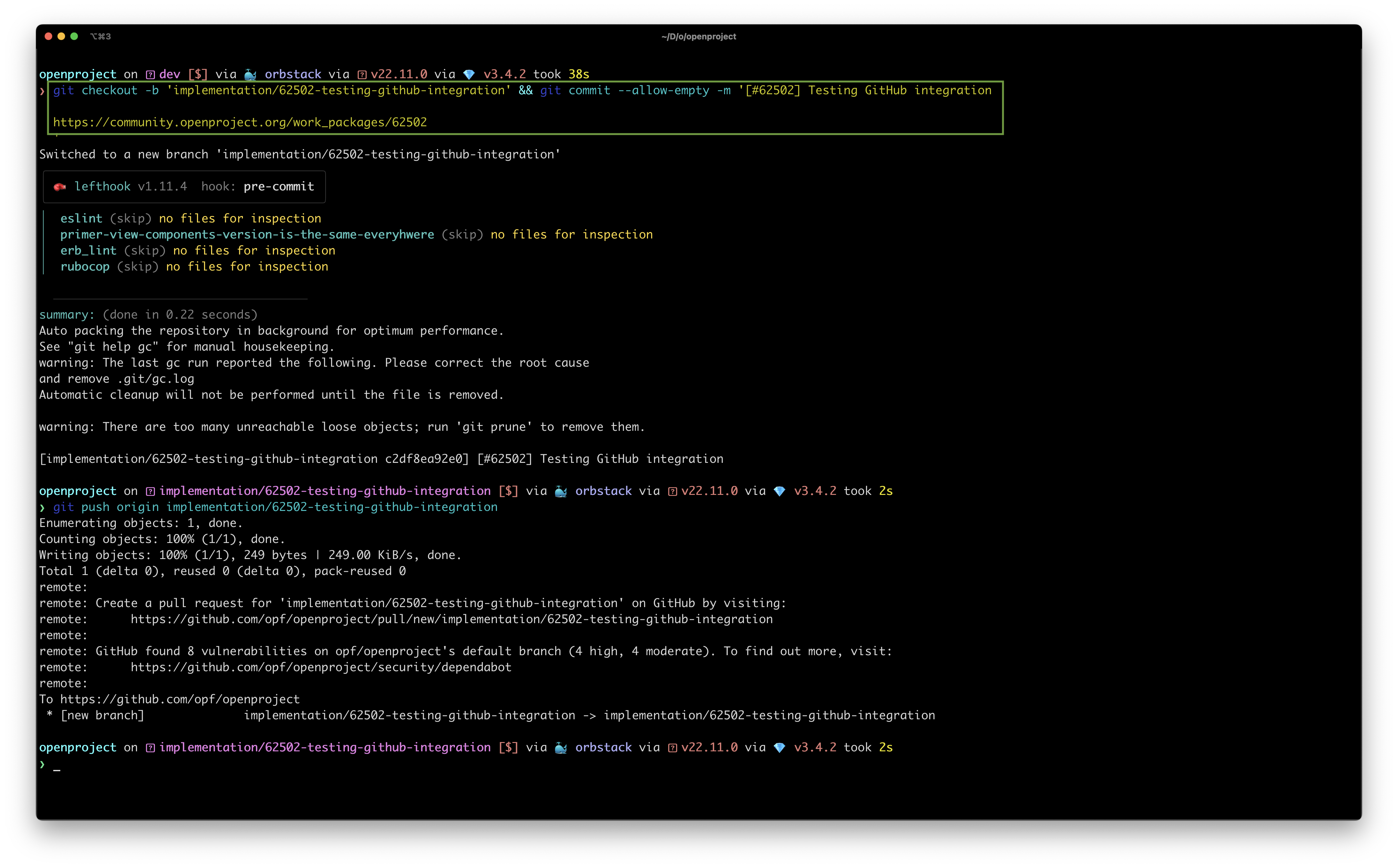 La captura de pantalla muestra cómo crear una nueva rama con una confirmación vacía en su terminal, utilizando el fragmento de código proporcionado por OpenProject. Cuando envía sus cambios, la integración añade una nota a la pestaña Actividad del paquete de trabajo junto con la pestaña GitHub, de forma automática y sin pasos adicionales.