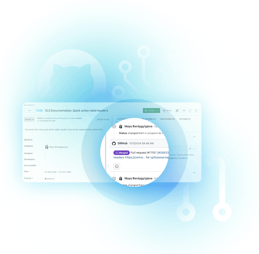La integración de GitHub funciona a la perfección con su flujo de trabajo de línea de comandos. Vincule las confirmaciones y las solicitudes de extracción a paquetes de trabajo en OpenProject simplemente haciendo referencia a sus ID, sin necesidad de salir de su editor de código.