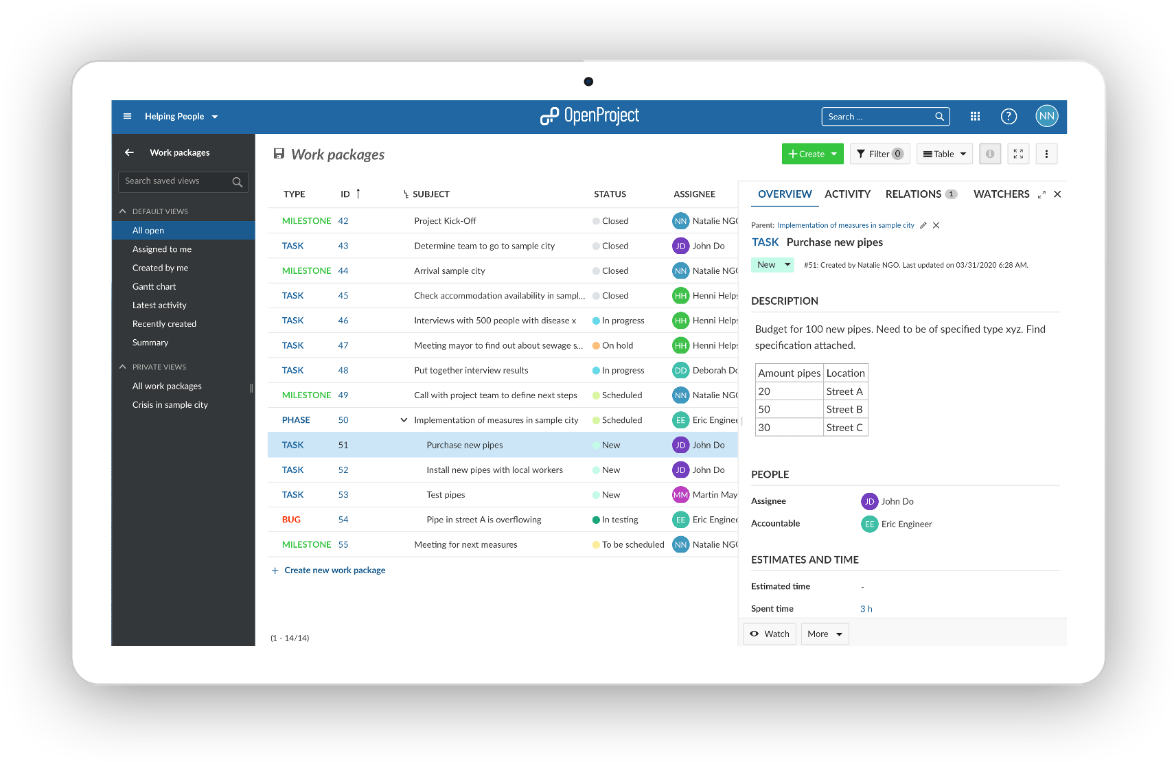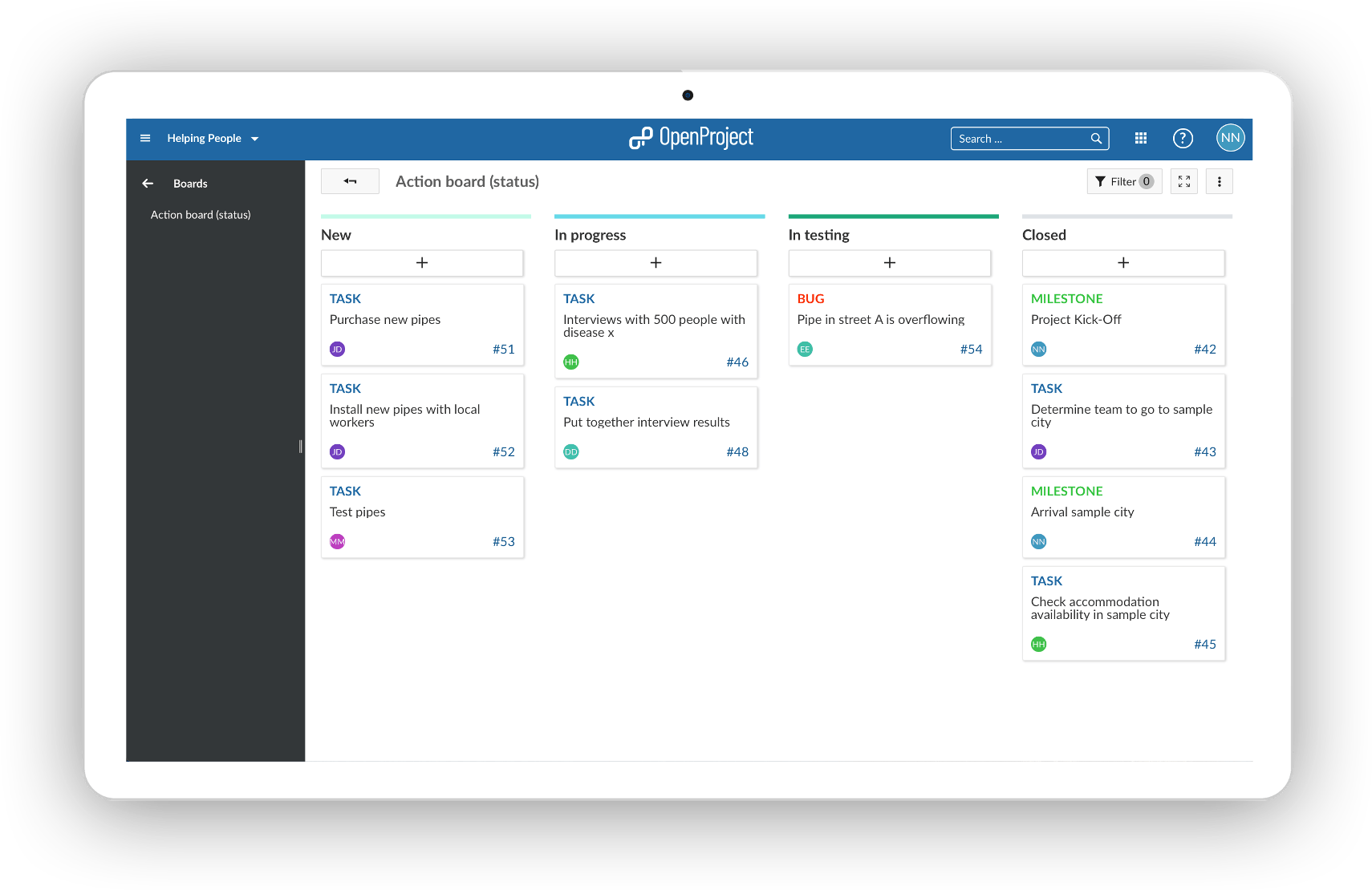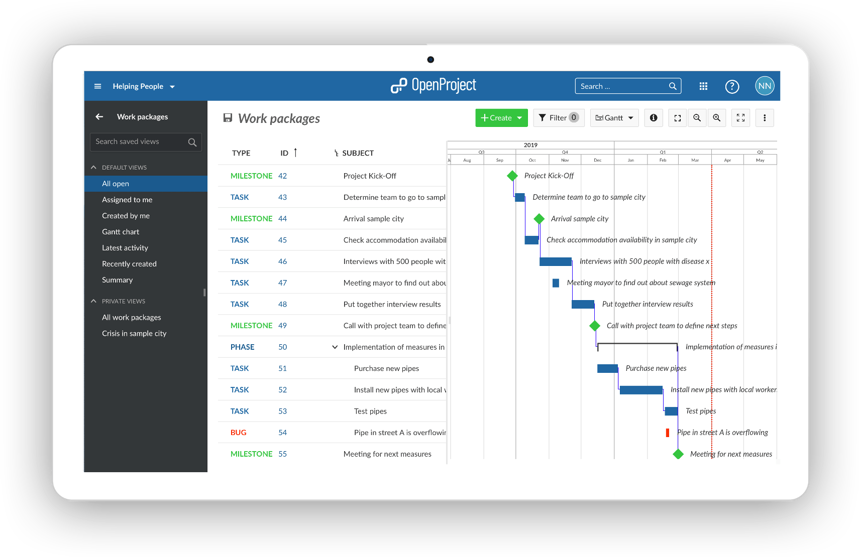 Ya sea para proyectos grandes, pequeños, cortos o largos, o para equipos de cualquier tamaño, OpenProject se adapta a sus necesidades. Es compatible con métodos de gestión de proyectos clásicos y Agile, por lo que le ofrece todas las posibilidades.