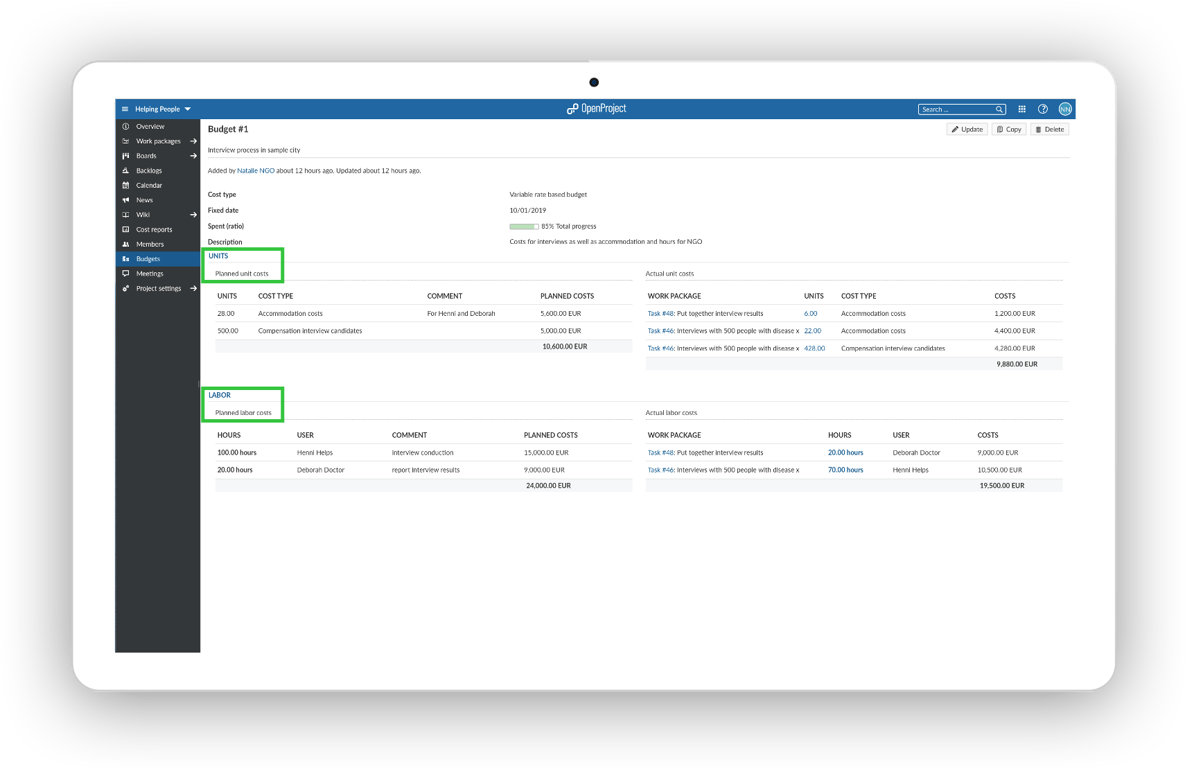 Planifique los costes de cada fase del proyecto y vea a simple vista qué parte del presupuesto asignado se ha usado (costes de material o personal).