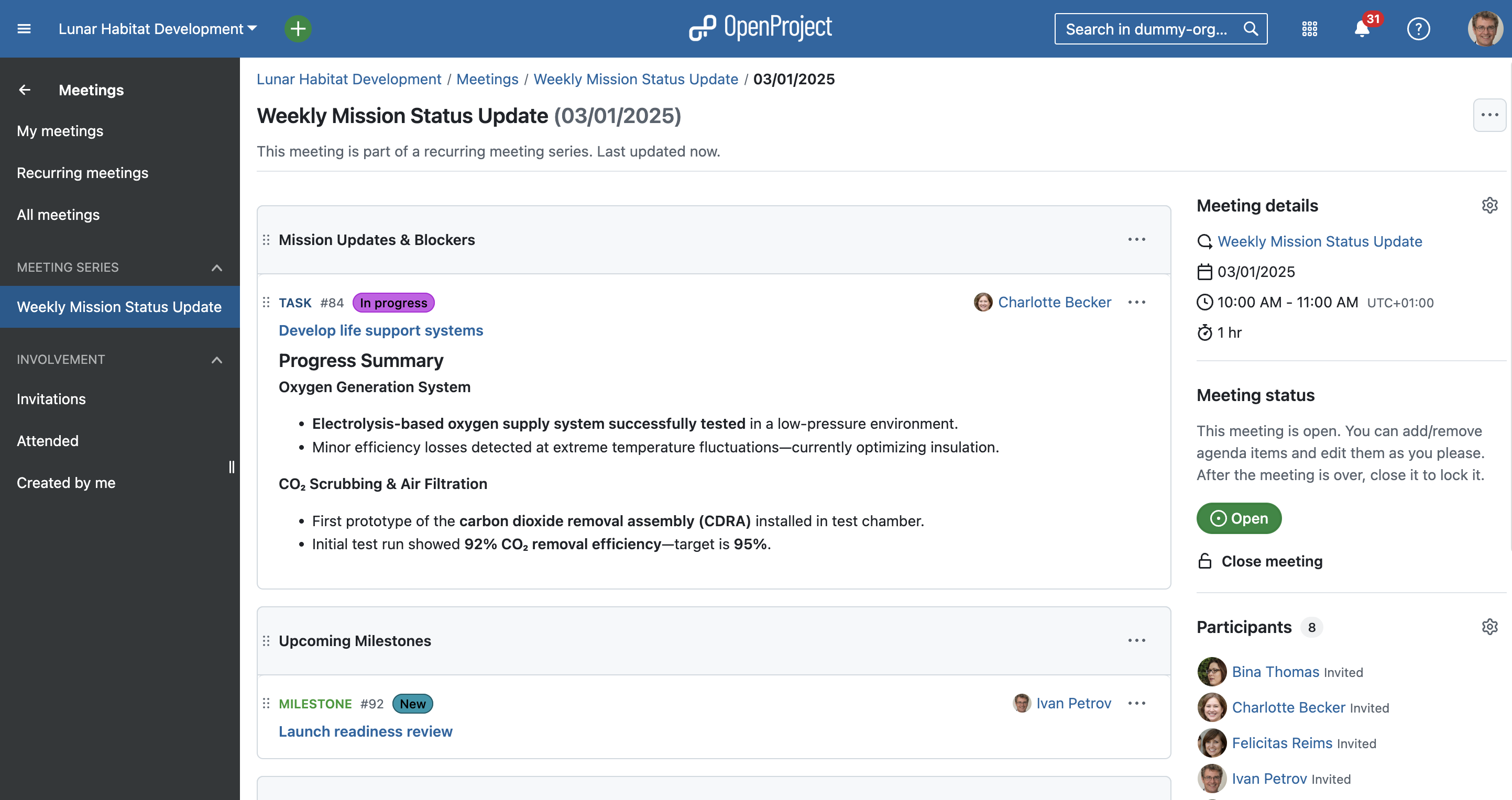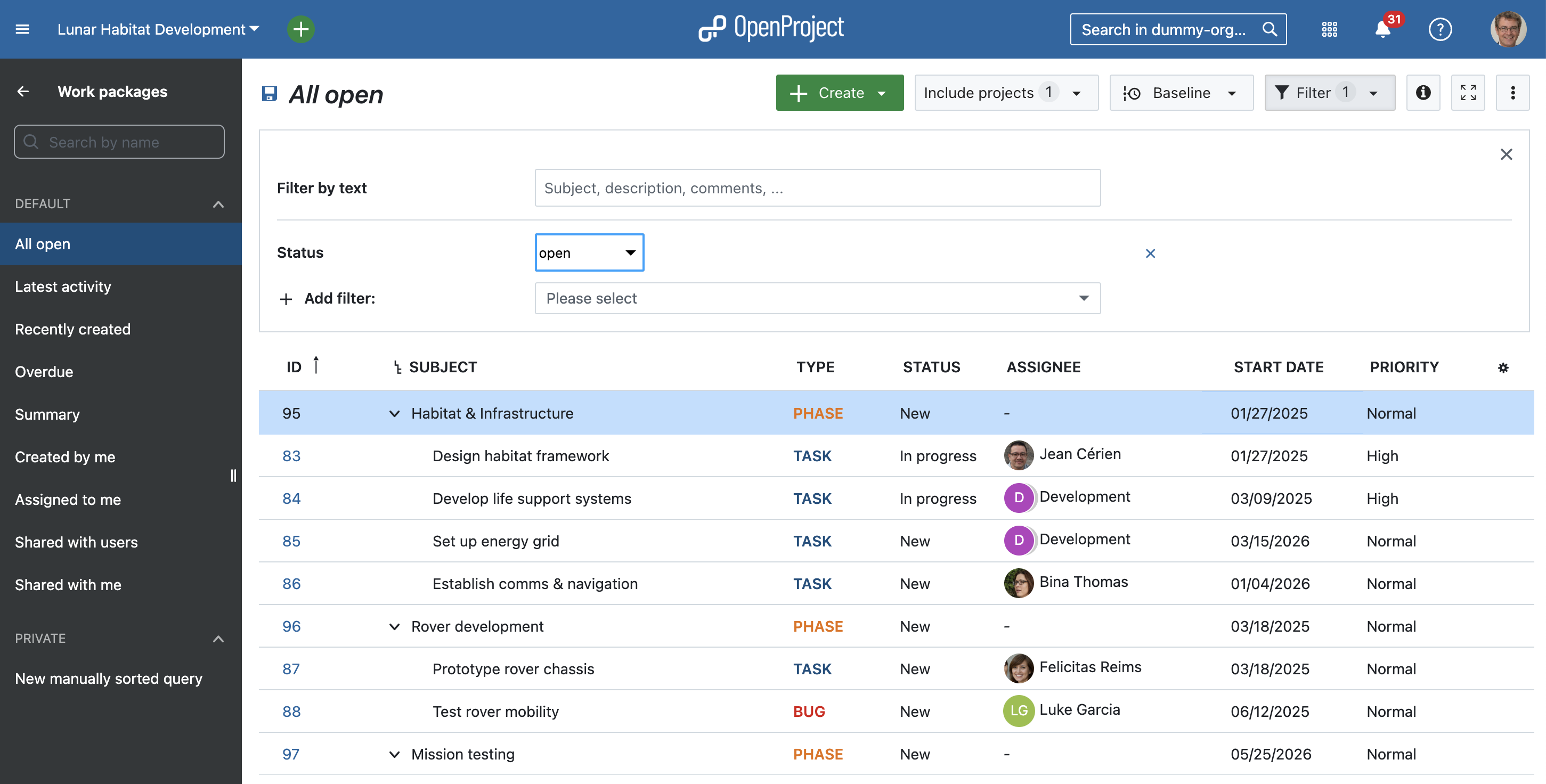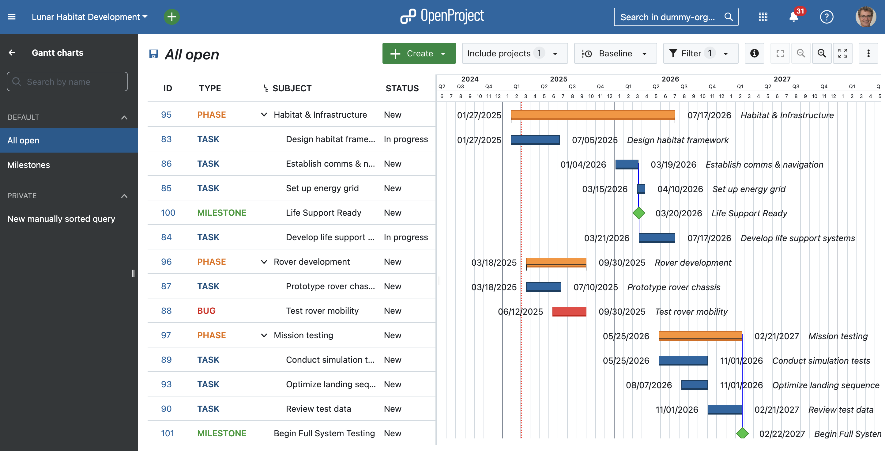 Personalice flujos de trabajo, objetivos, proyectos, miembros, funciones, paneles de control y mucho más para adaptarse a las necesidades de cada equipo. Adapte OpenProject a los requisitos específicos de cada misión y acceda a toda la información del proyecto desde cualquier lugar.