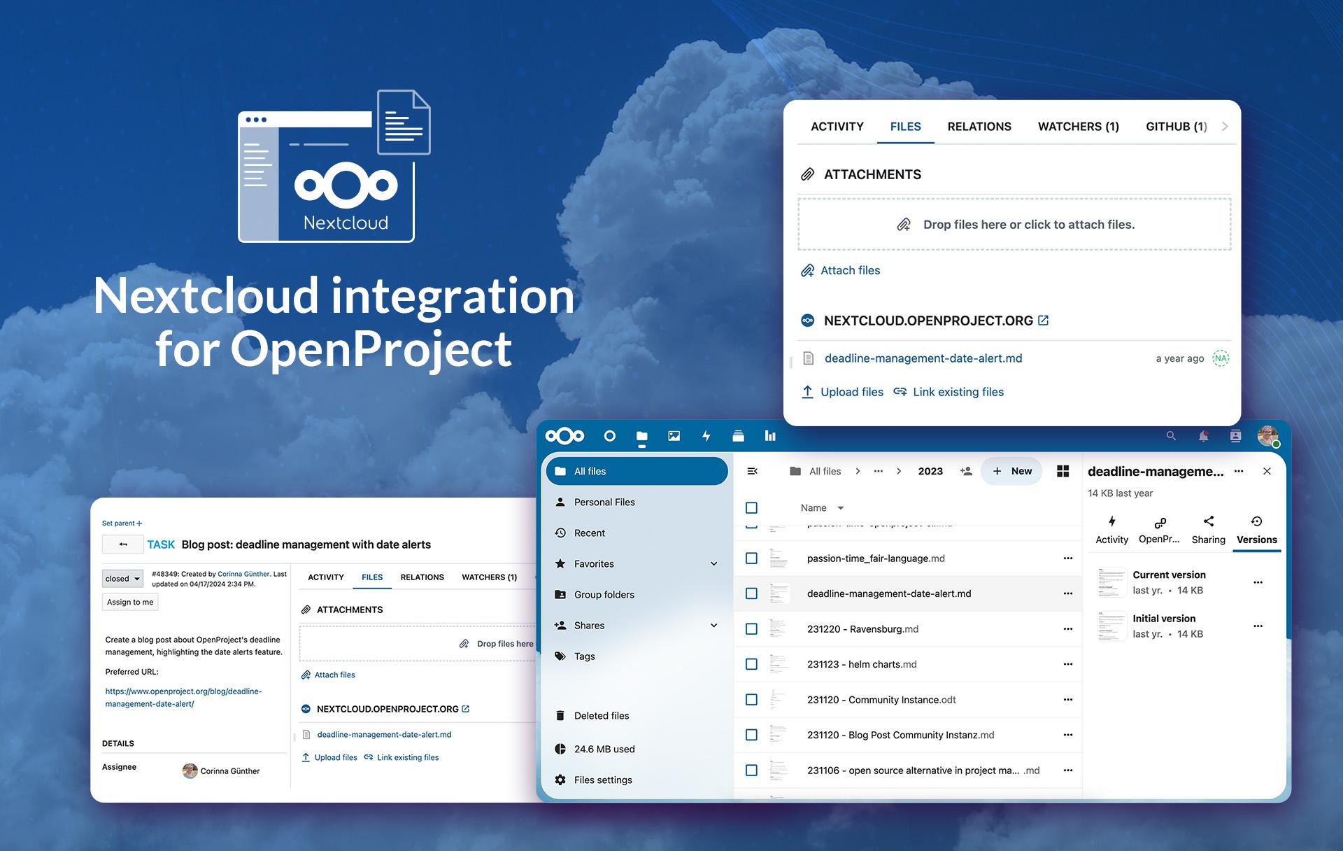 Combine la potencia del software de código abierto con el control total de los datos: Integre la gestión de proyectos de OpenProject con la gestión de archivos segura y autoalojada de Nextcloud.