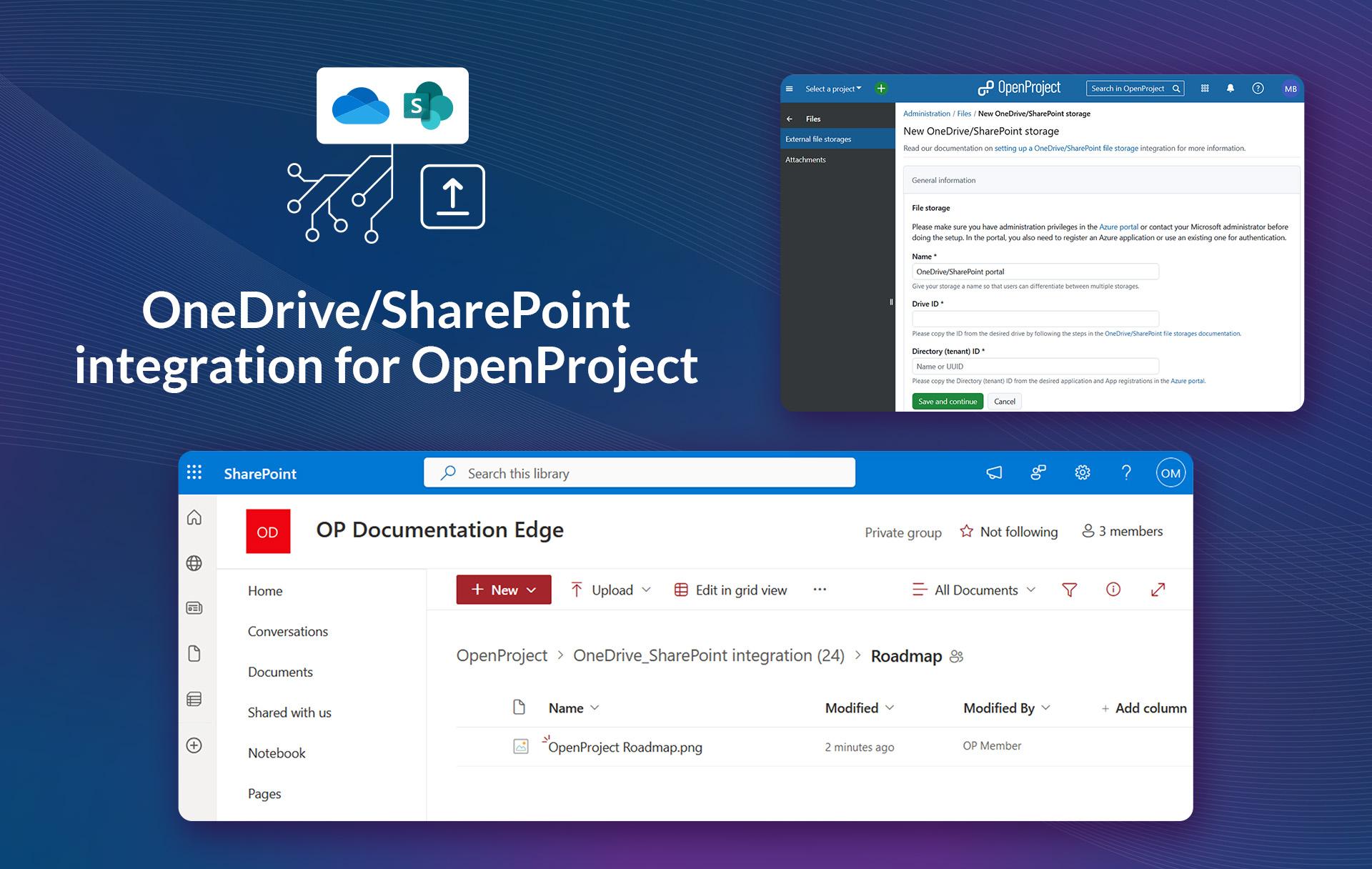 Integre OpenProject con las herramientas establecidas en su organización: Agilice la gestión de documentos integrando SharePoint o OneDrive con sus proyectos en OpenProject.