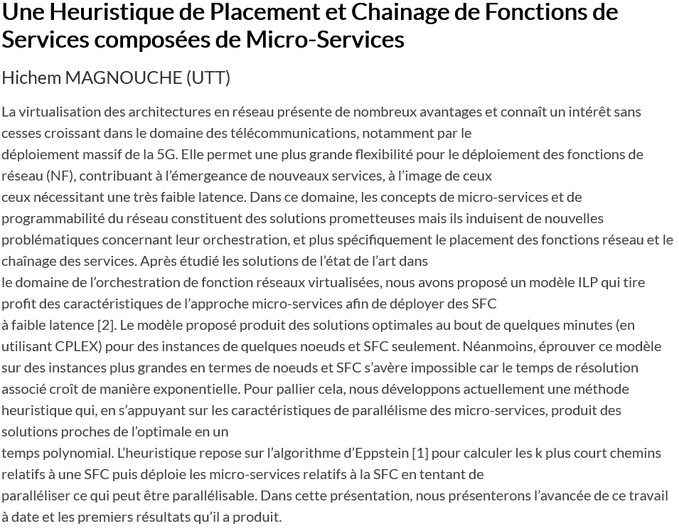 - 10 Novembre 2022: presented at Journée NetOpt 2022 Optimisation et algorithmes pour les réseaux Soutenue par les GdR RSD et l’axe REST du GdR-RO. "Placement et Chainage de Fonctions de Services composées de Micro-Services : Modélisation et Résolution" (see abstract and slides)